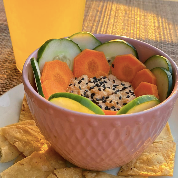Hummus hecho en casa, pure de garbanzo con especias, servido con totopos y zanahoria
