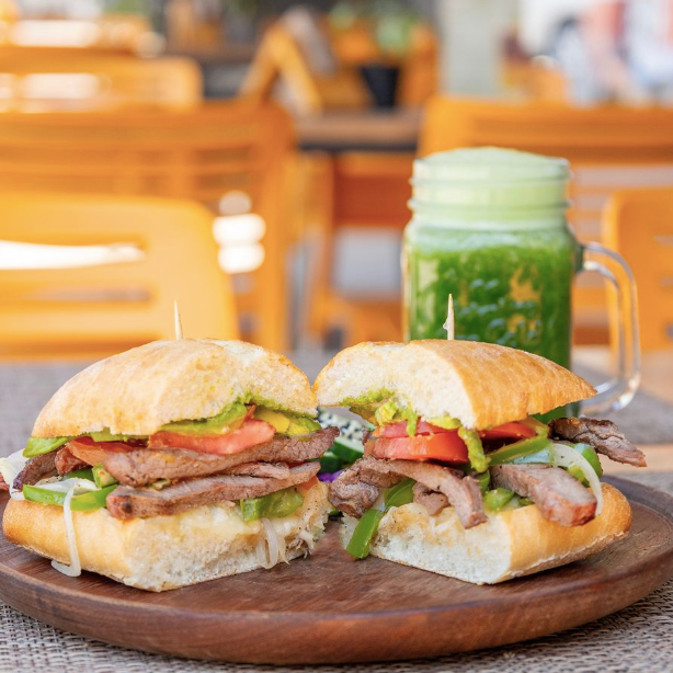 Arrachera con pimientos, cebolla, jitomate y aguacate, servido en pan chapata y acompañado de ensalada verde.