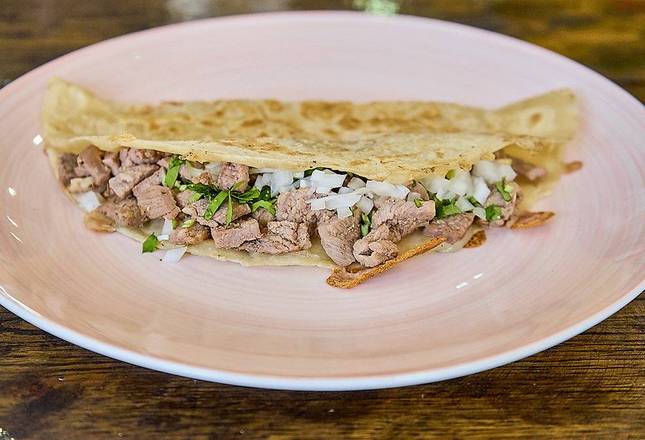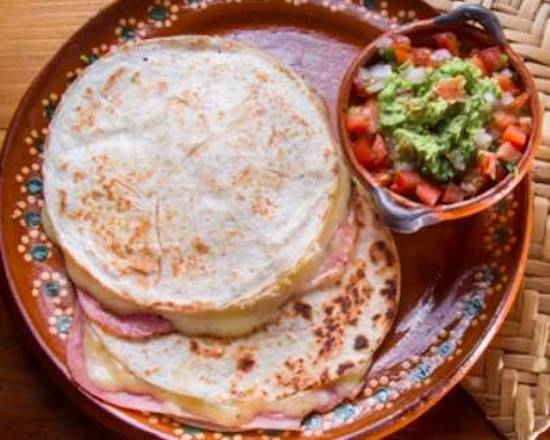 Cuatro piezas de quesadilla, con tortilla de maíz.
