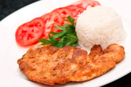 Pechuga empanizada de pollo acompañada con arroz, frijoles, tortillas.