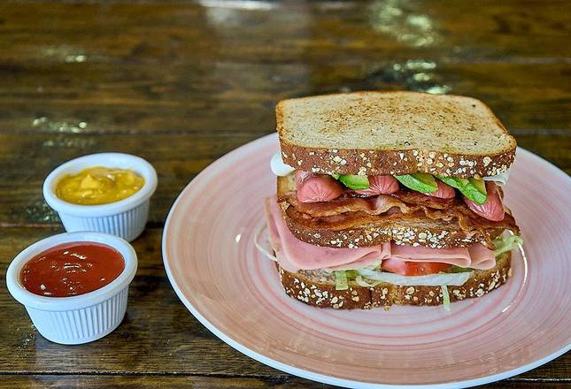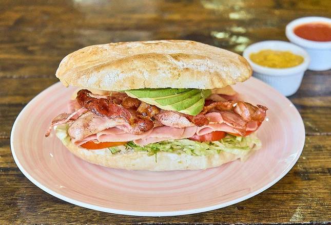 Jamón, tocino, queso fundido, huevo, aguacate lechuga, jītomate, cebolla y mayonesa.