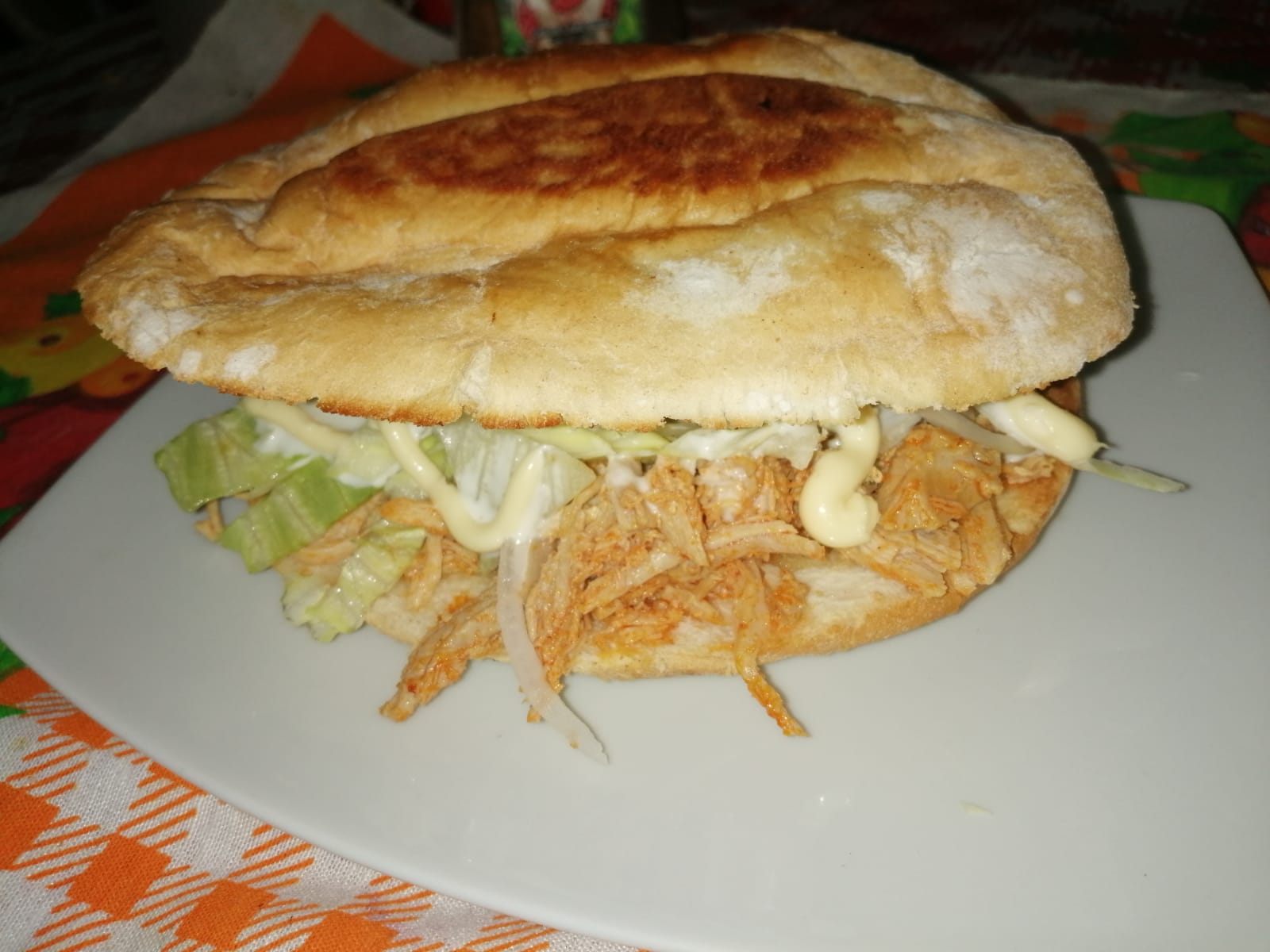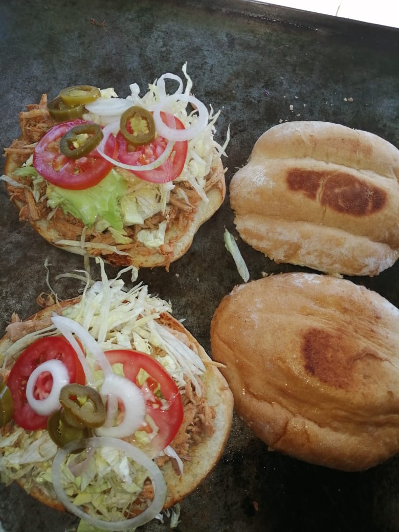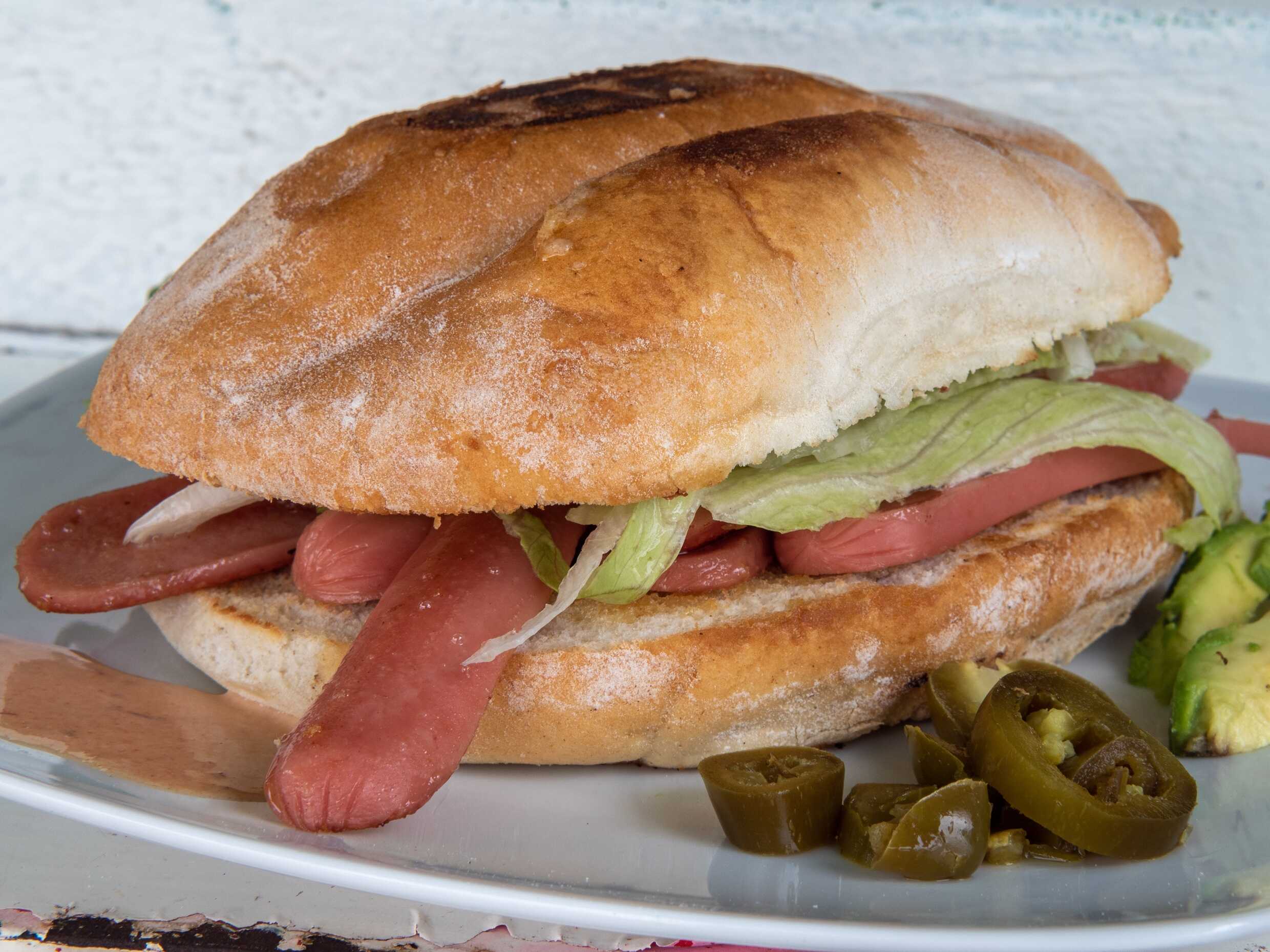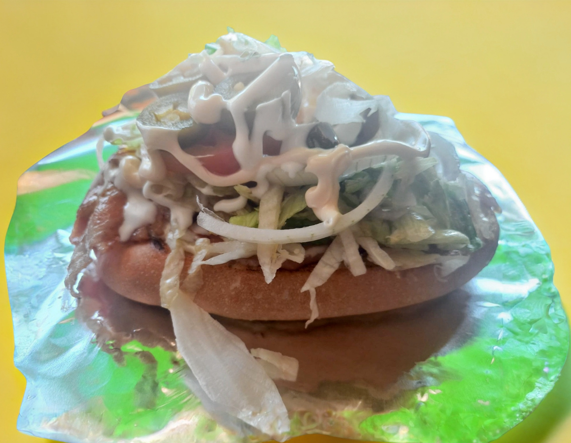 Telera dorada en plancha con salchicha dorada en plancha y encima lechuga, cebolla, Crema o Mayonesa, jitomate y chile