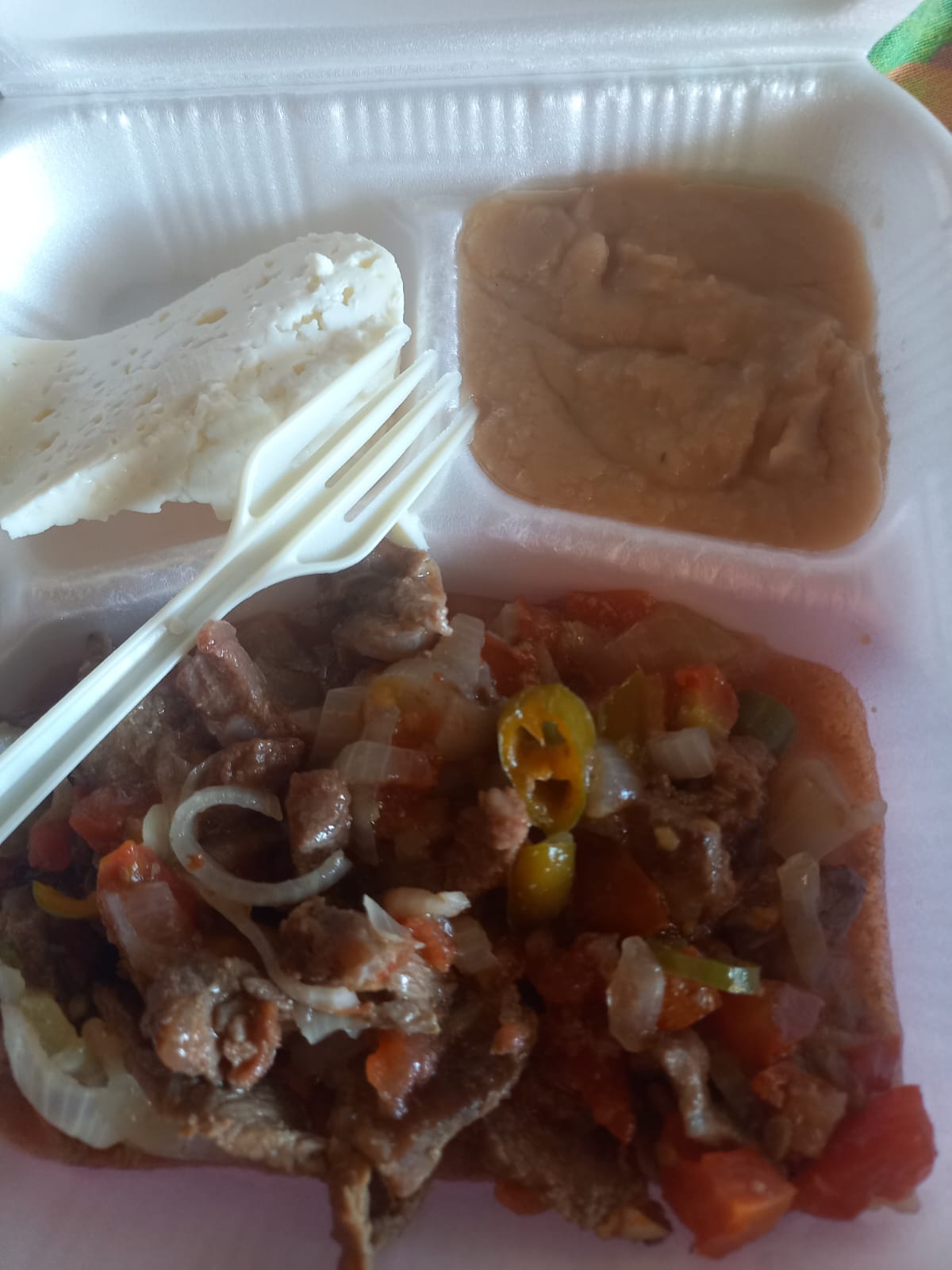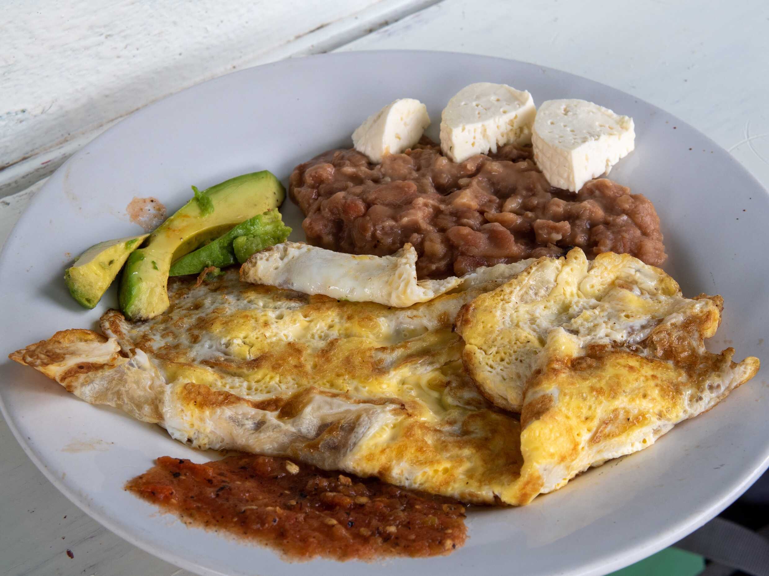 Huevo hecho en plancha con un toque de mantequilla y con frijoles