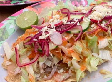 Tostada de maiz grande con su ingrediente y encima Lechuga/Col cebolla morada, salsa de tomate y queso fresco