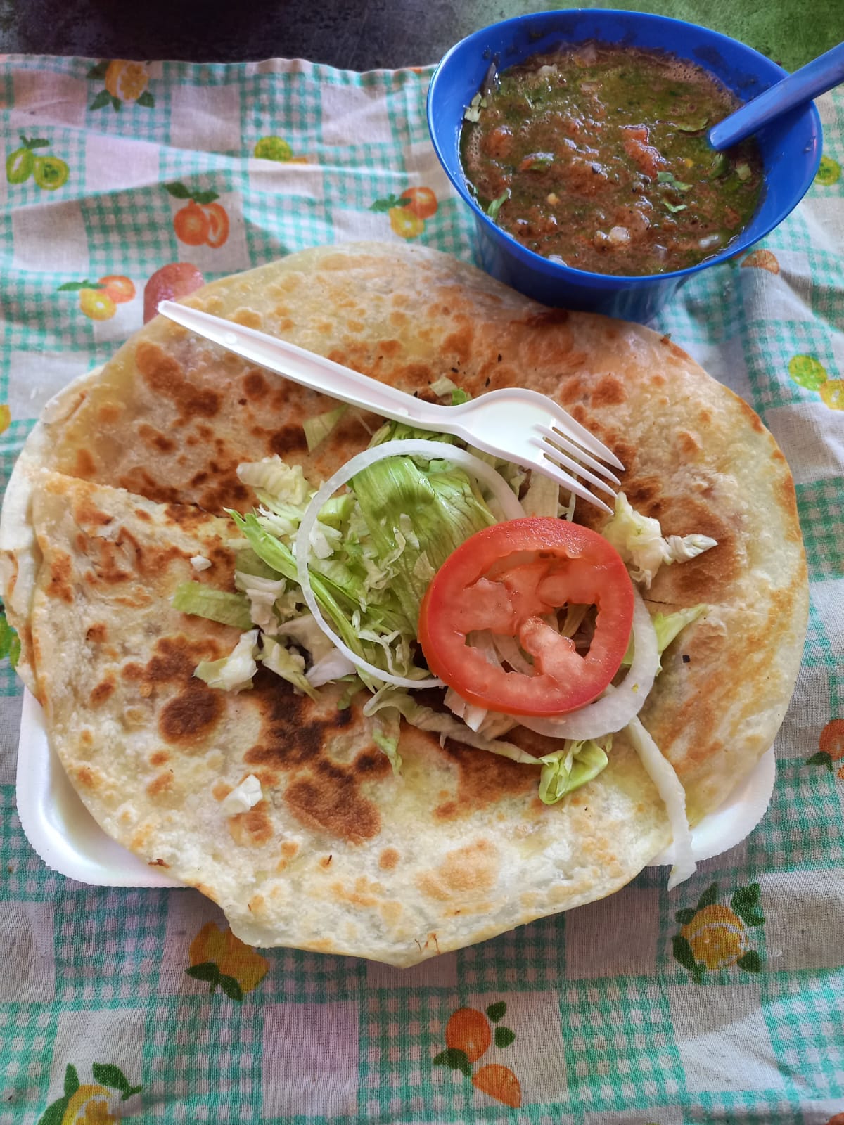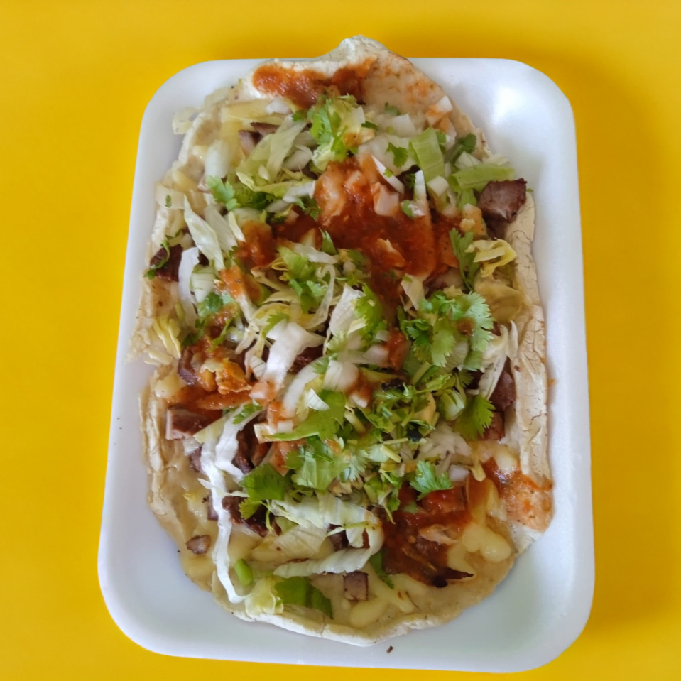 Masa extendida con queso oaxaca, su ingrediente y encima lechuga, cilantro, cebolla y salsa de tomate