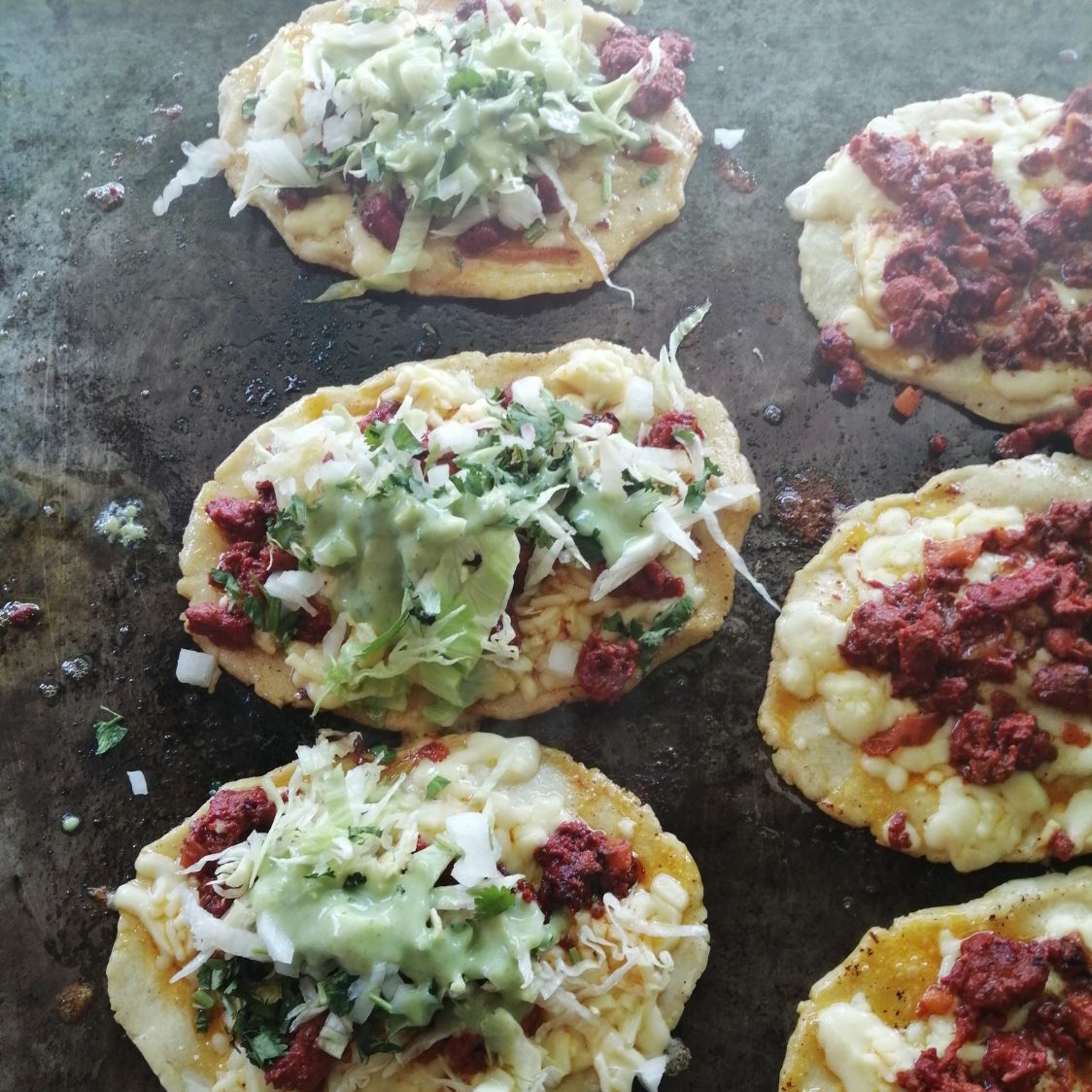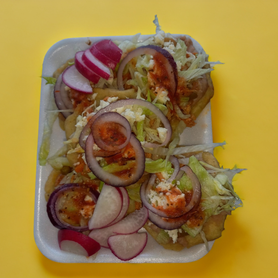 Masa dorada en aceite con su ingrediente y encima lechuga, queso fresco, cebolla morada, salsa de tomate y un toque de crema