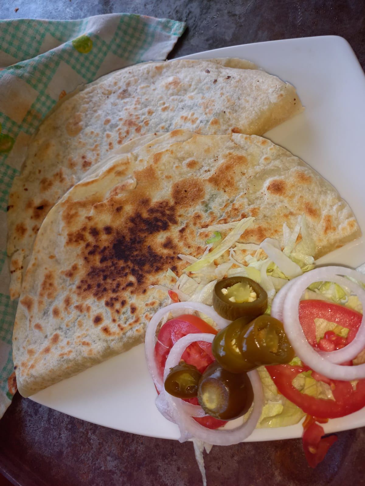 Dos tortillas de harina en forma de sandwich y en medio queso oaxaca, su ingrediente, cebolla, jitomate y chile jalapeño cocinado en plancha