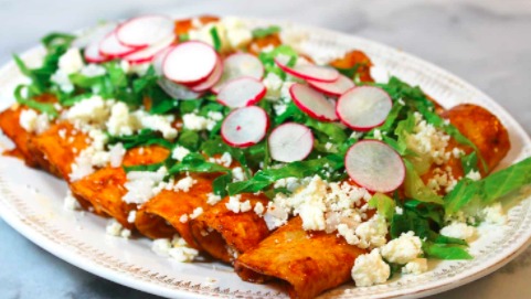 Tortilla bañada en salsa roja pasada en aceite enrollado con su ingrediente y encima lechuga, cebolla morada, queso fresco y crema