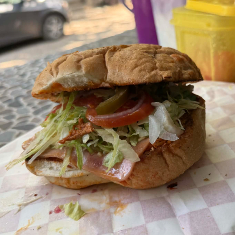 Mayonesa, jamón, lechuga, cebolla, jitomate, jalapeño