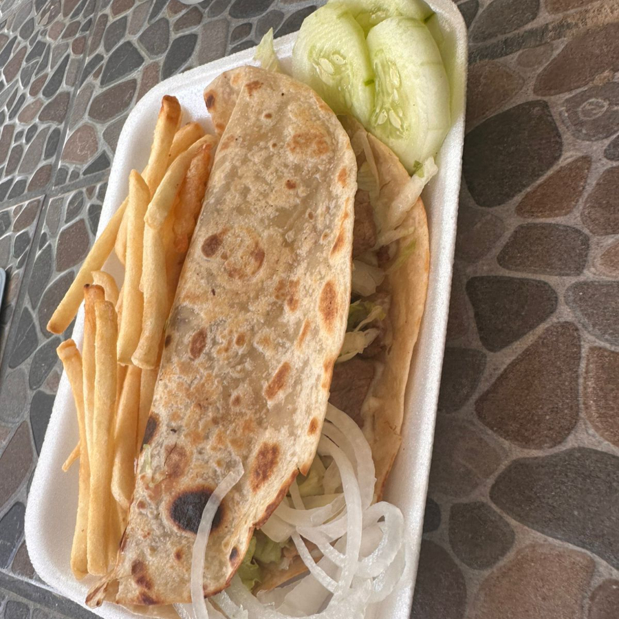 Tortilla de Harina, carne, lechuga, cebolla y pepino, incluye papas