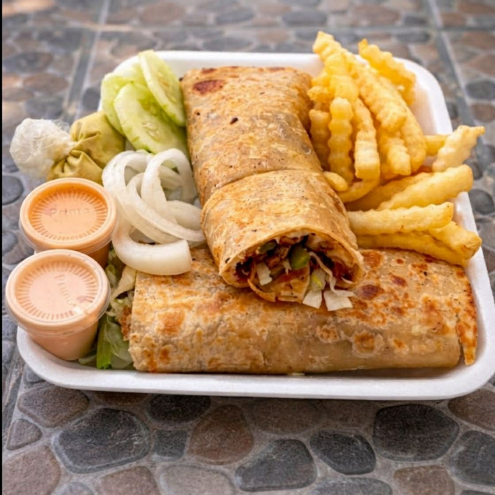 Tortilla de Harina, carne, morron, cebolla, lechuga. incluye papas