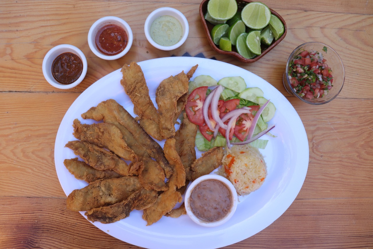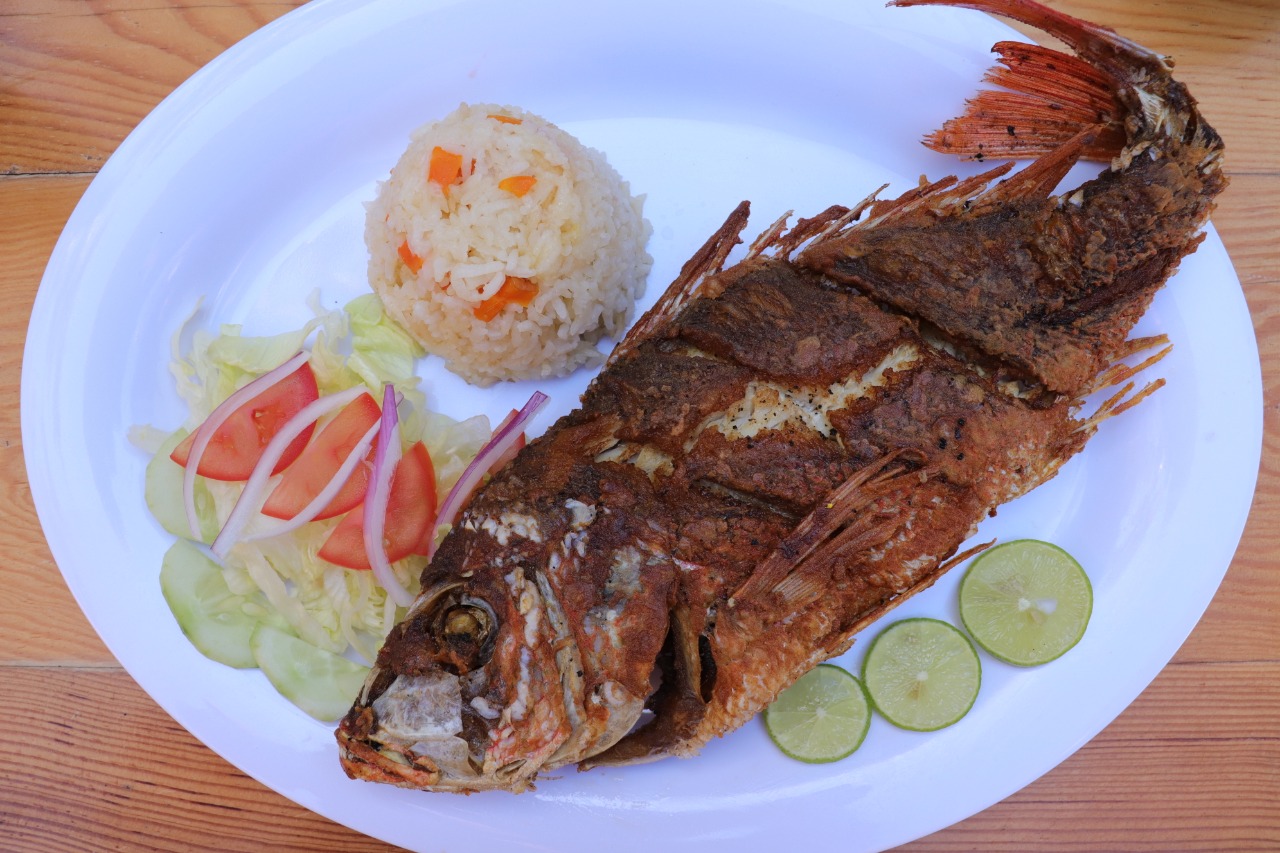 Pescado frito acompañado de frijoles,tortillas, arroz y ensalada.