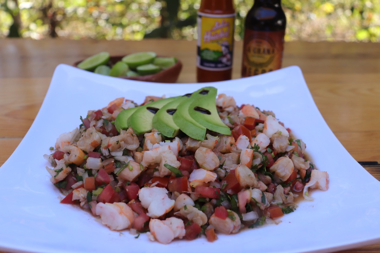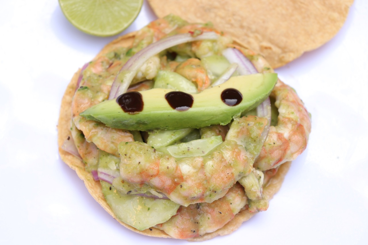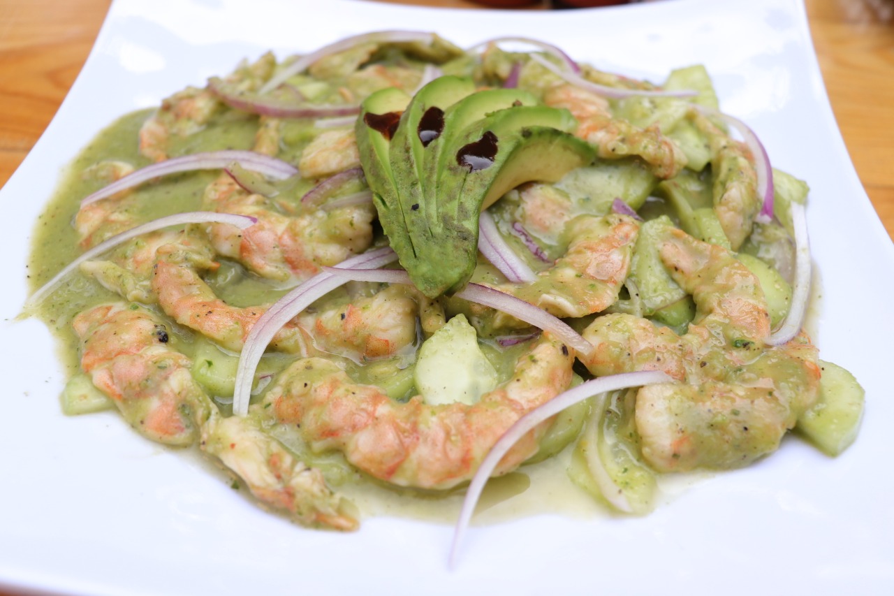 Camarones frescos encurtidos en salsa VERDE con pepino y cebolla morada.