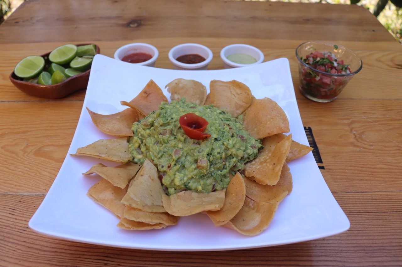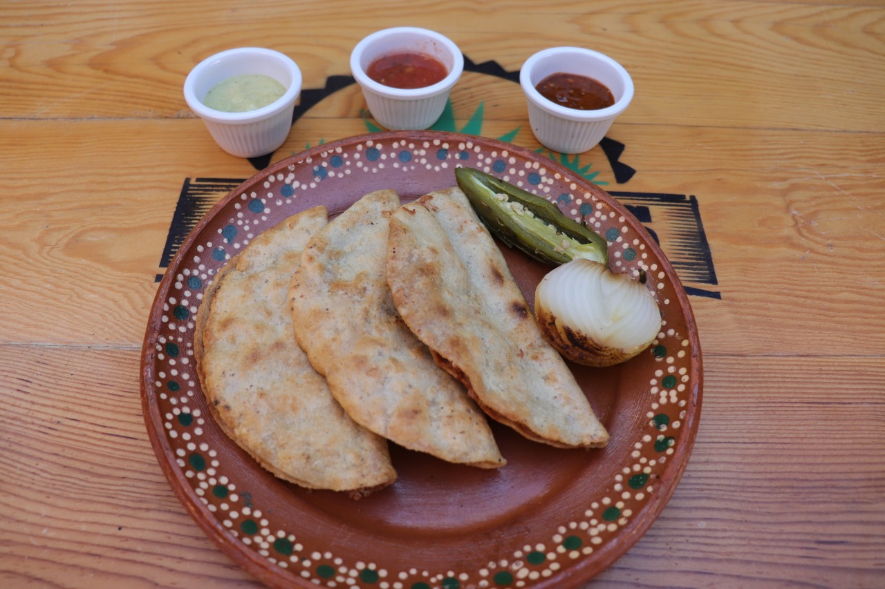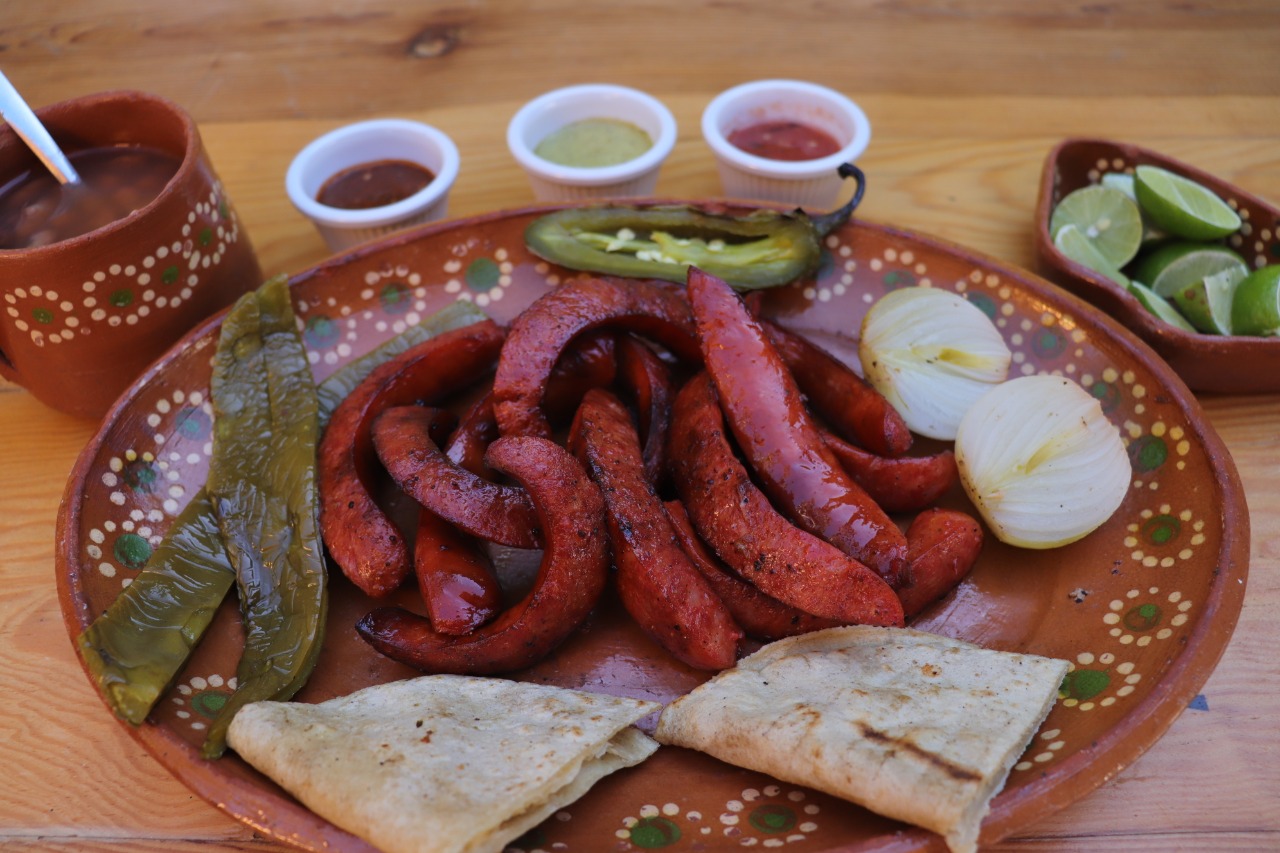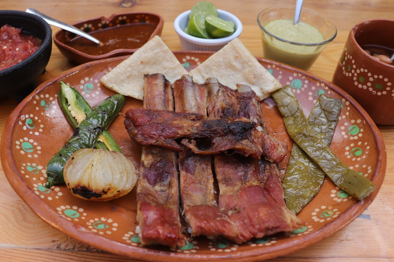 Lechon, costilla, asada, pollo, chorizo, nopales, quesadillas, cebolla, frijoles, salsas y tortillas hechas a mano