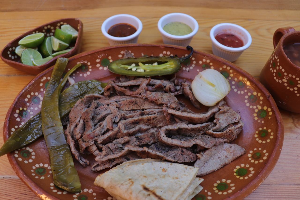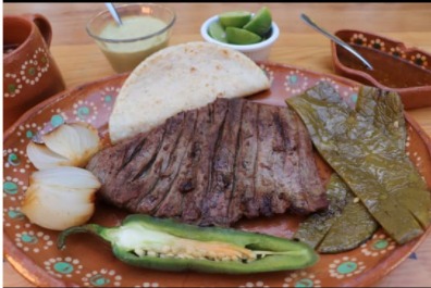 Aprox 300 grs acompañado de: nopal, quesadilla, frijoles, cebollita ,salsa y limon.