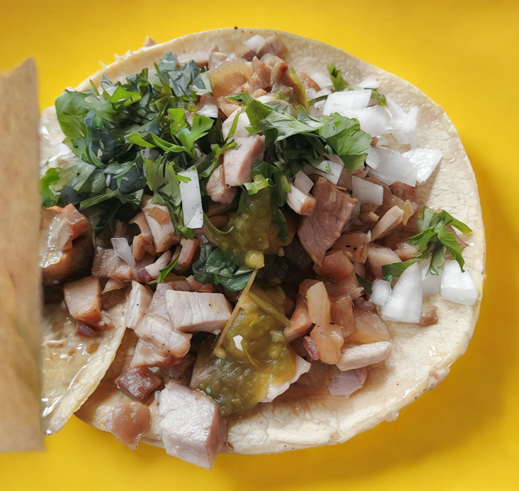 Todas las carnes, col, cebolla cruda, cebolla asada, cilantro y frijoles