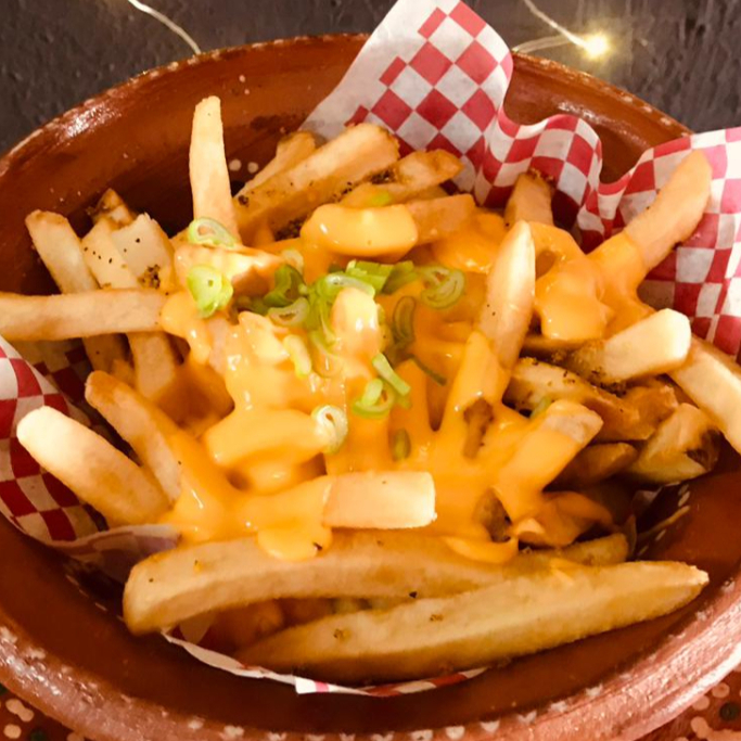 TOTOPOS DE MAIZ CUBIERTOS POR UNA MEZCLA DE FRIJOLES REFRITOS Y QUESO CHEDDAR. SALSA MEXICANA JALAPEÑOS Y LA PROTEINA DE TU ELECCION
