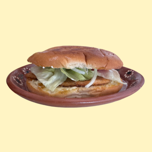 Preparada con milanesa de pollo empanizada, lechuga, jitomate, cebolla, chile y aguacate