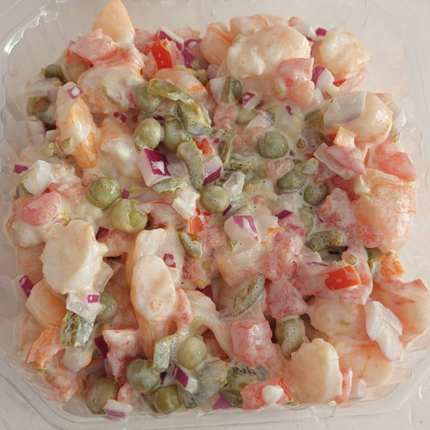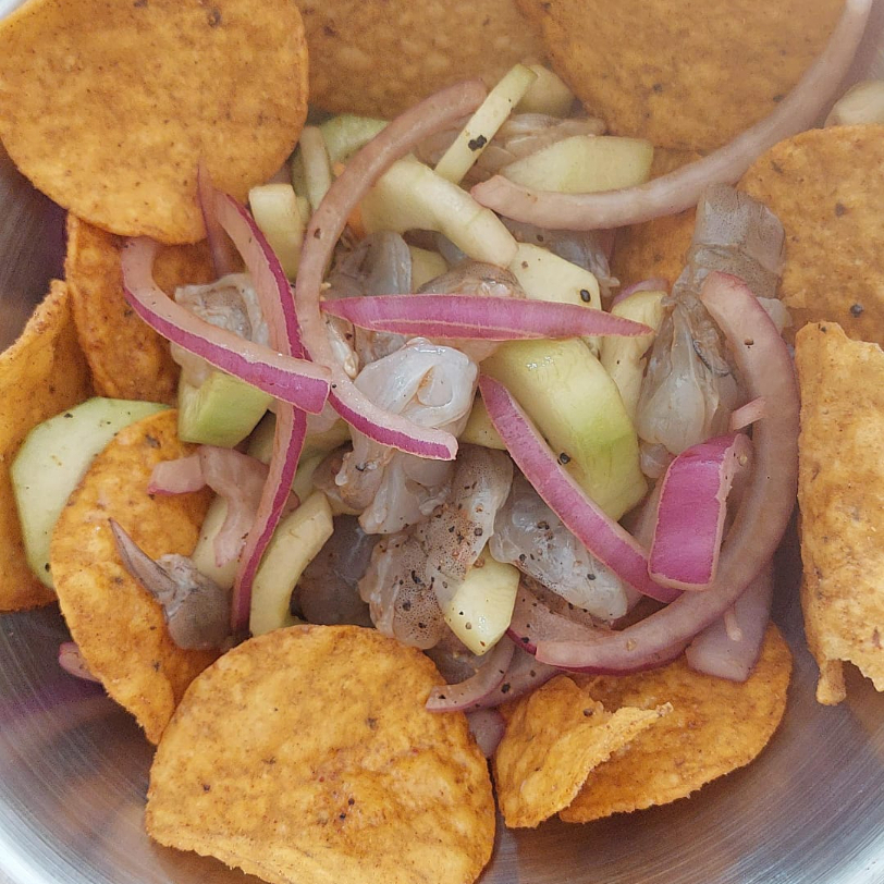CAMARON COSIDO CHICHARO MAYONESA JITOMATE CEBOLLA