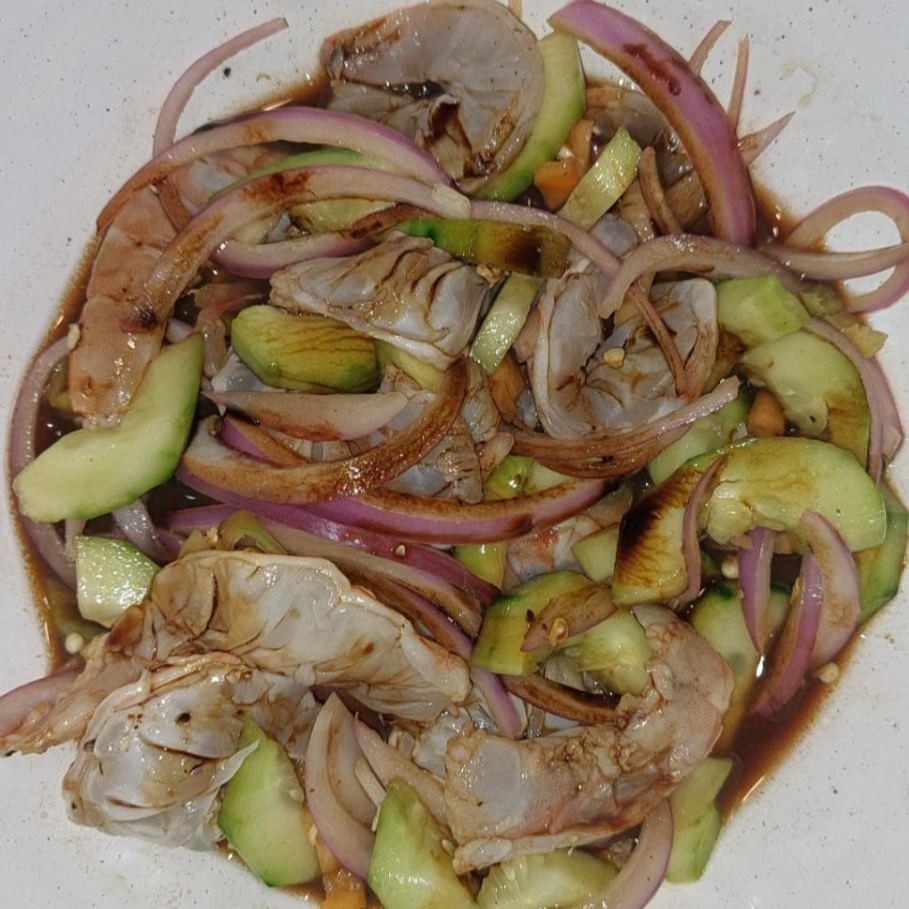 CAMARON COSIDO EN FUEGO PEPINO LIMON CEBOLLA CHILE HABANERO