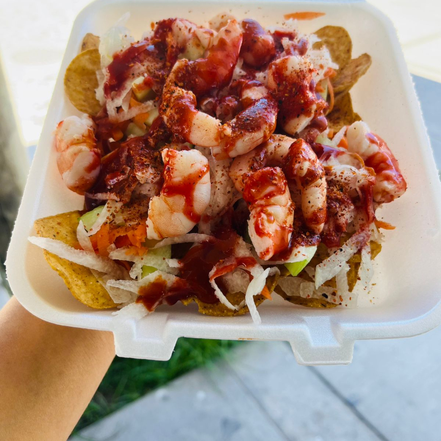 CAMARON COSIDO EN FUEGO FRUTA PIACADA CHAMOY LIMON SALSA