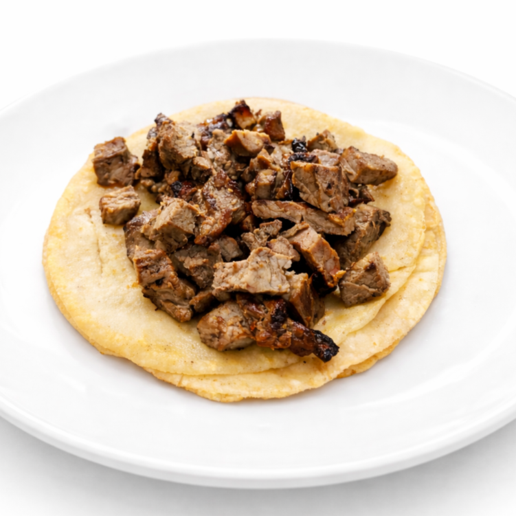 Taco con sirloin y chicharrón con tortilla torteada