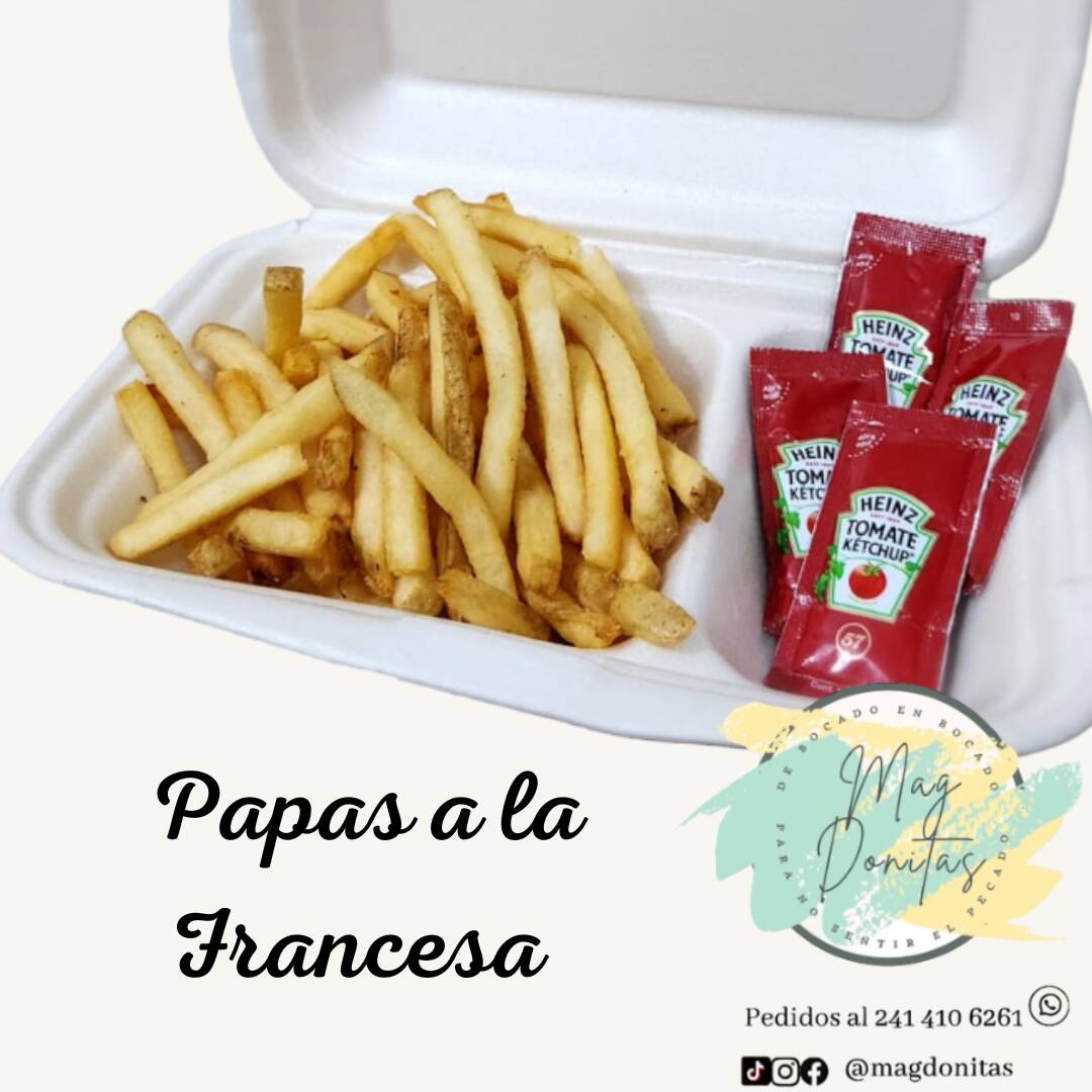 Deliciosas papas a la francesa fritas, acompañadas con catsup y salsa valentina