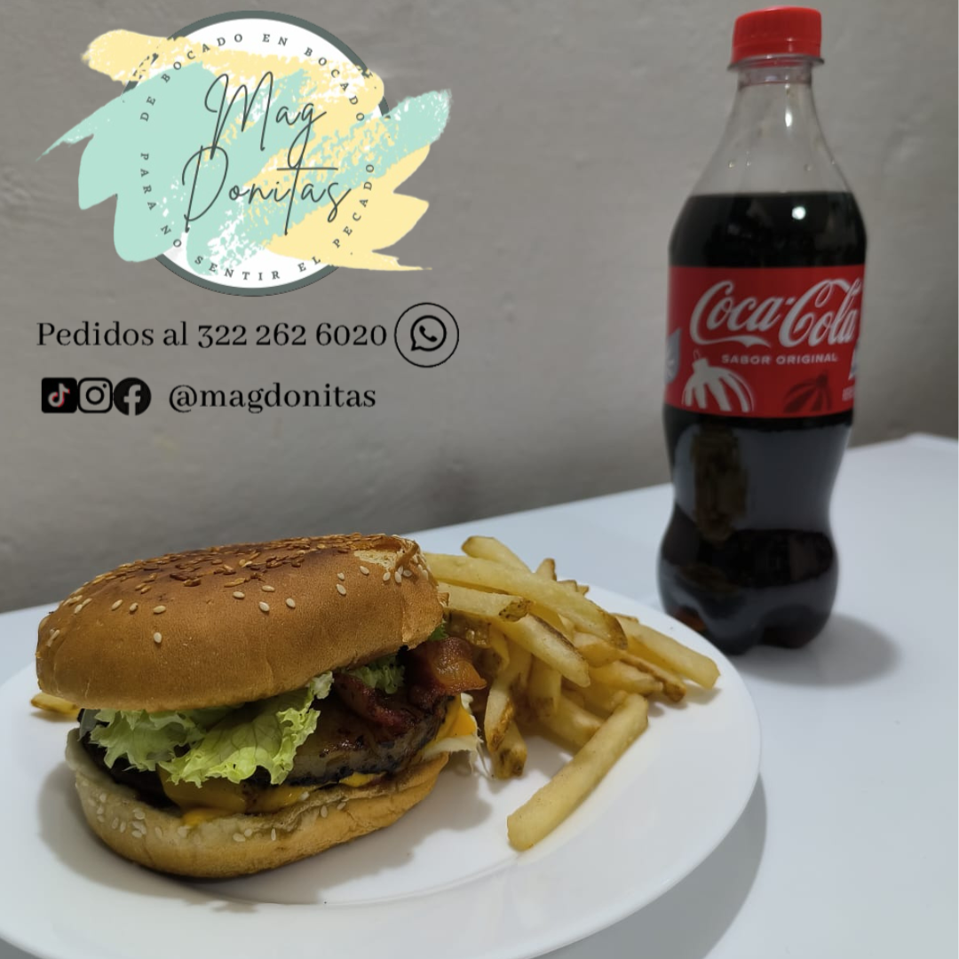 Deliciosa hamburguesa con carne, tocino, lechuga, jitomate, acompañada de papas a la francesa y coca cola de 600ml