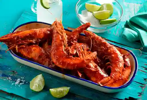 Camarones con cáscara, preparación de la casa, acompañados de arroz, ensalada y pan.