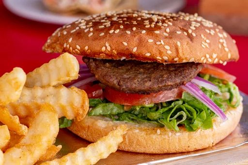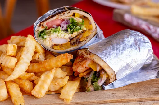Camarones con pimientos gratinados acompañados con papas fritas y aderezo chipotle.