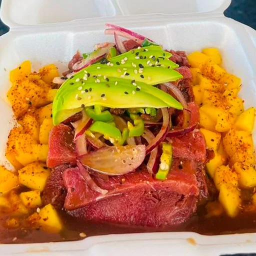 Atún fresco marinado con limón, soya, habanero, serrano, cebolla, piña y aguacate.