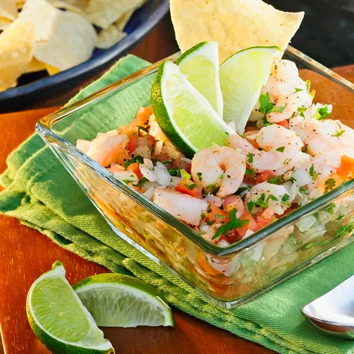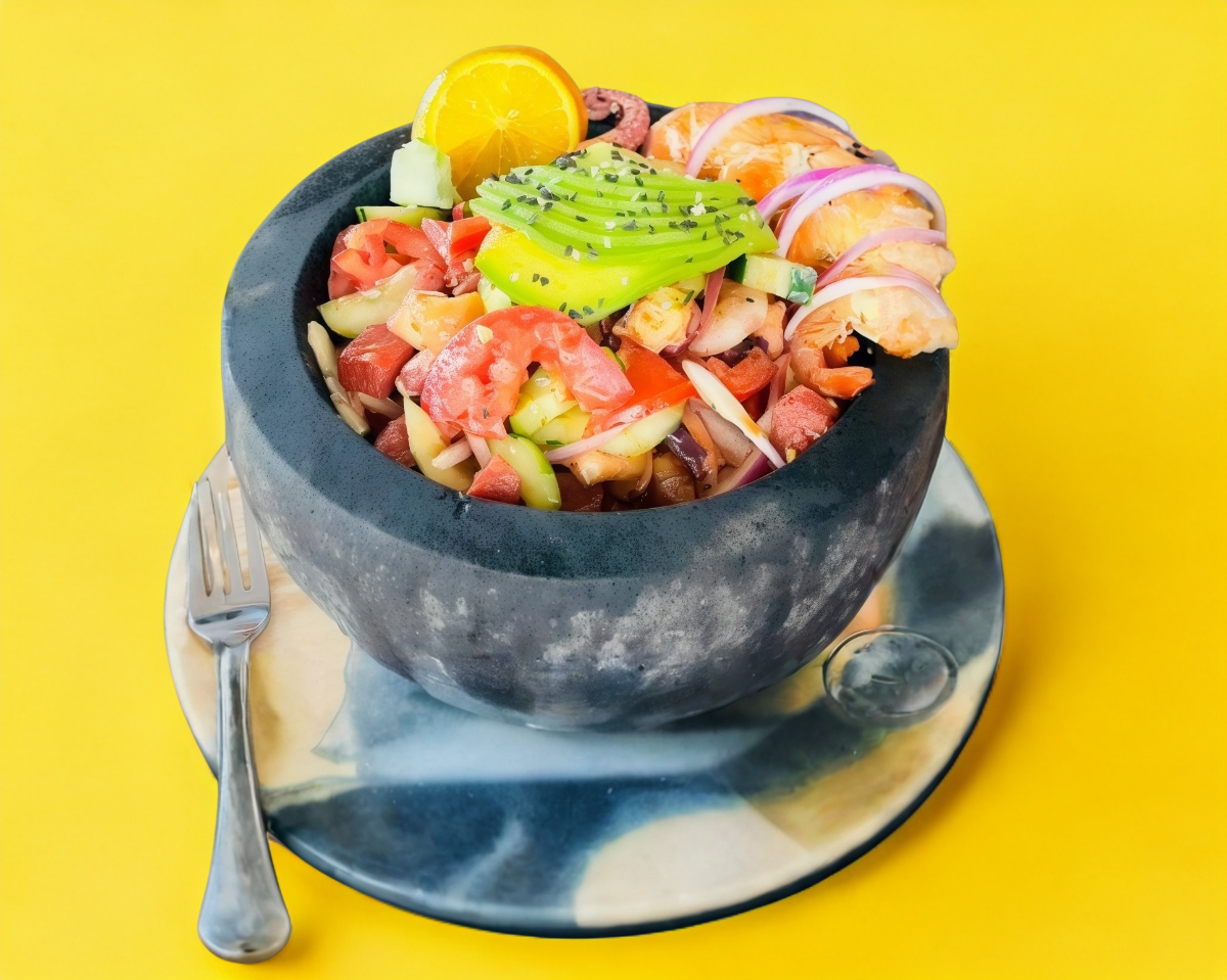 Ceviche de pescado, camarón cocido, curtido, seco, callo, atún, pepino, tomate, cebolla, mango y aguacate.