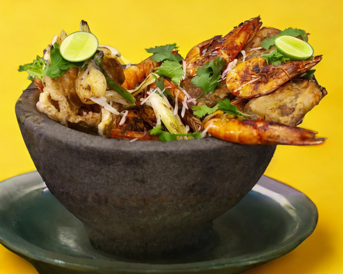 Consomé, camarón cocido, pulpo, callo, jaiba, mejillones y aguacate.