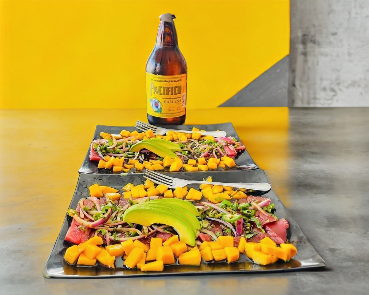 Atún fresco marinado con limón, soya, cebolla, serrano y aguacate.