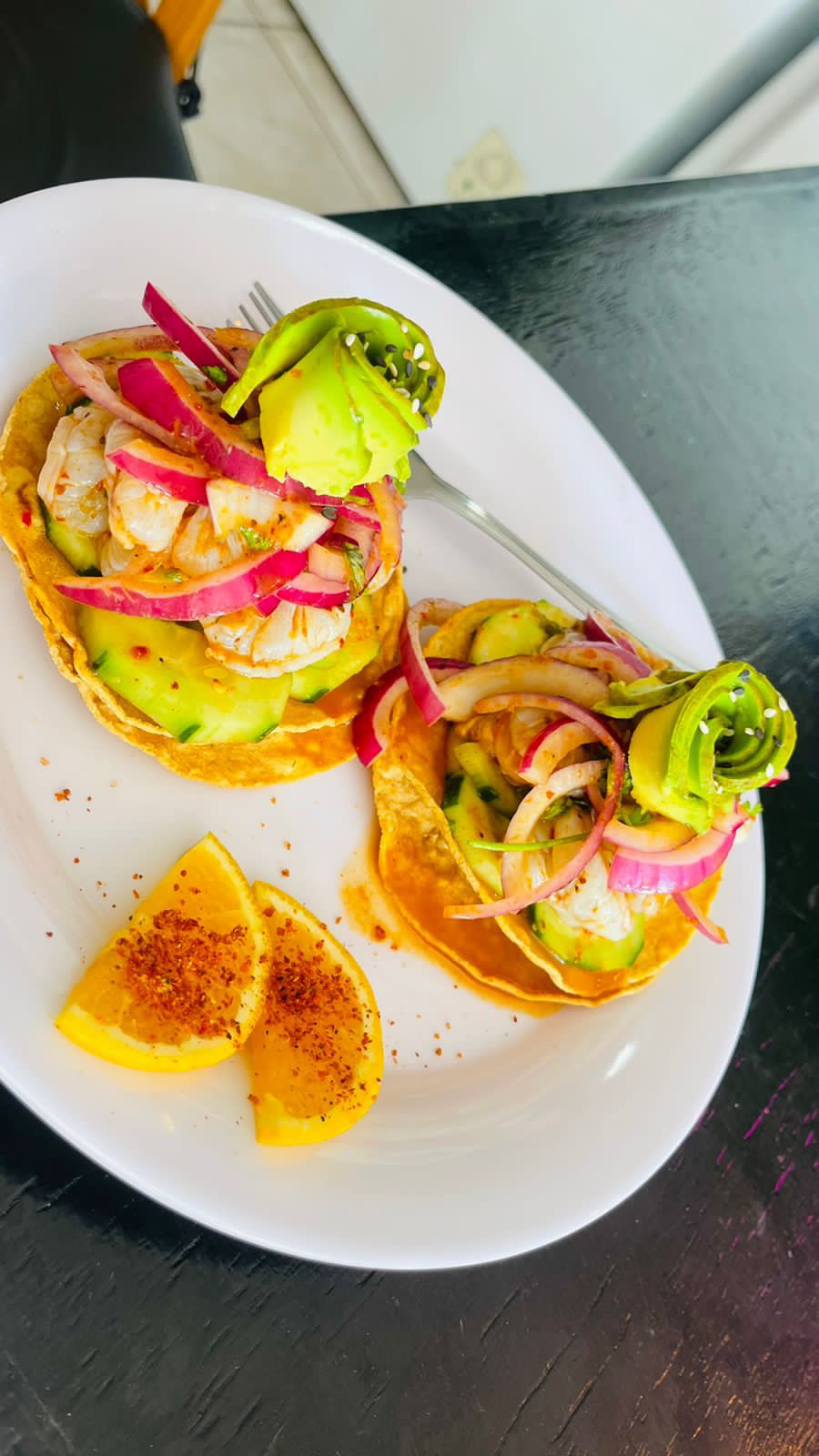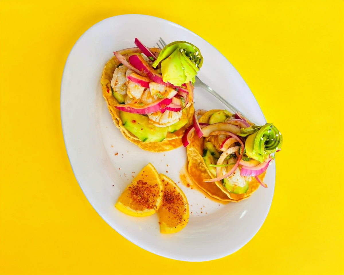 Tostada de camarón cocido, pepino, tomate y cebolla.