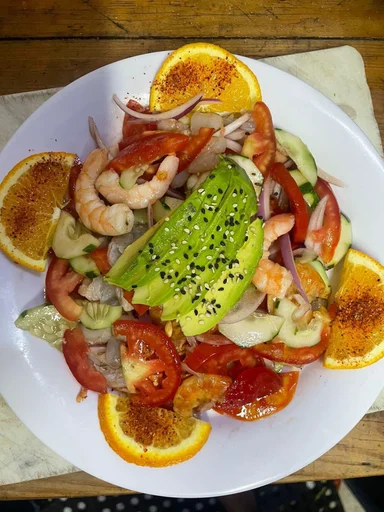 Camarón curtido, cocido, seco, callo, atún, pepino, tomate, cebolla y aguacate, bañado en salsa especial de la casa.