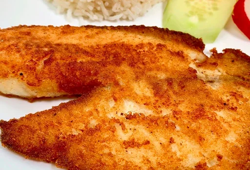 Camarones por mitad, salpimentados y empanizados con panco, acompañados de arroz, ensalada y pan.
