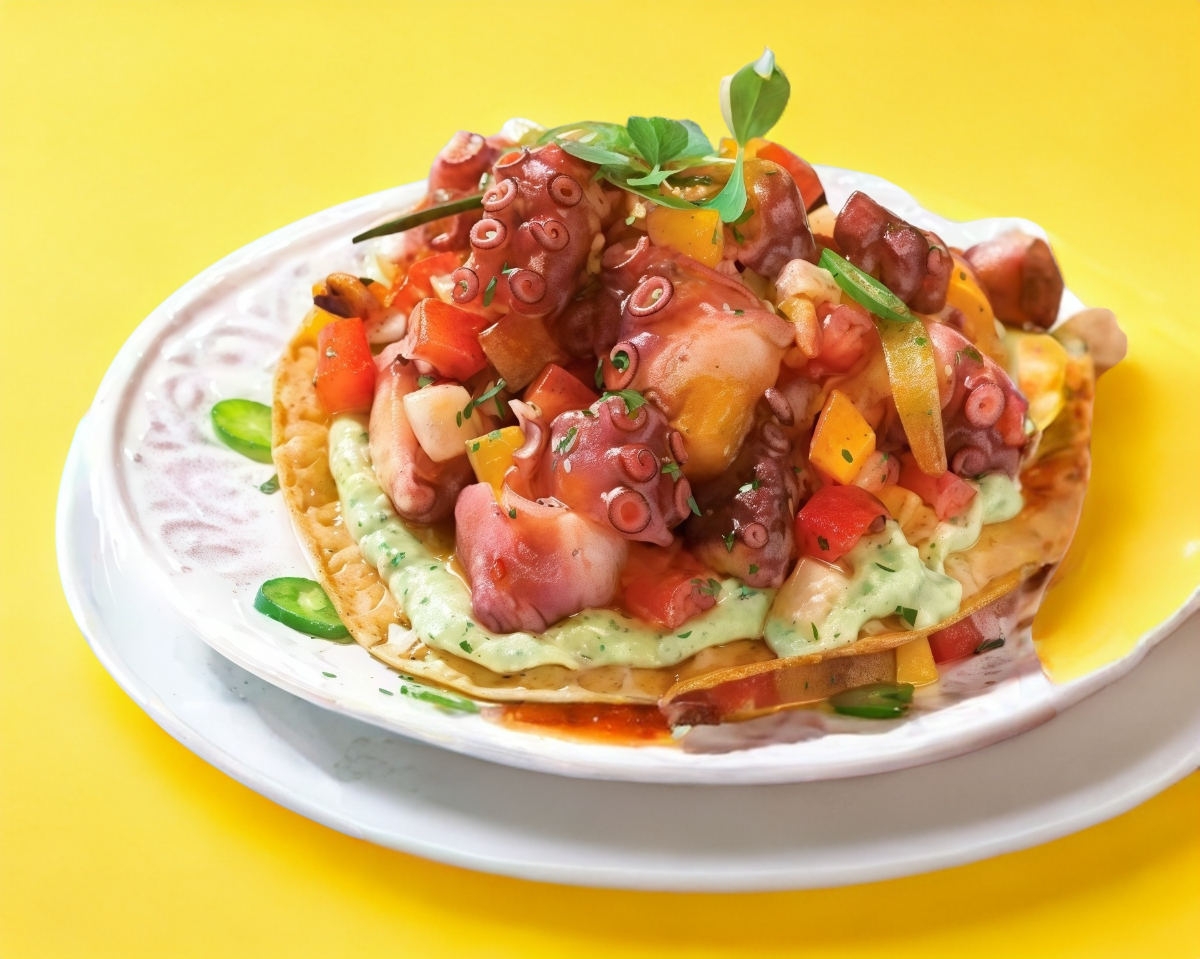 Tostada de pulpo curtido, cebolla, pepino y tomate.