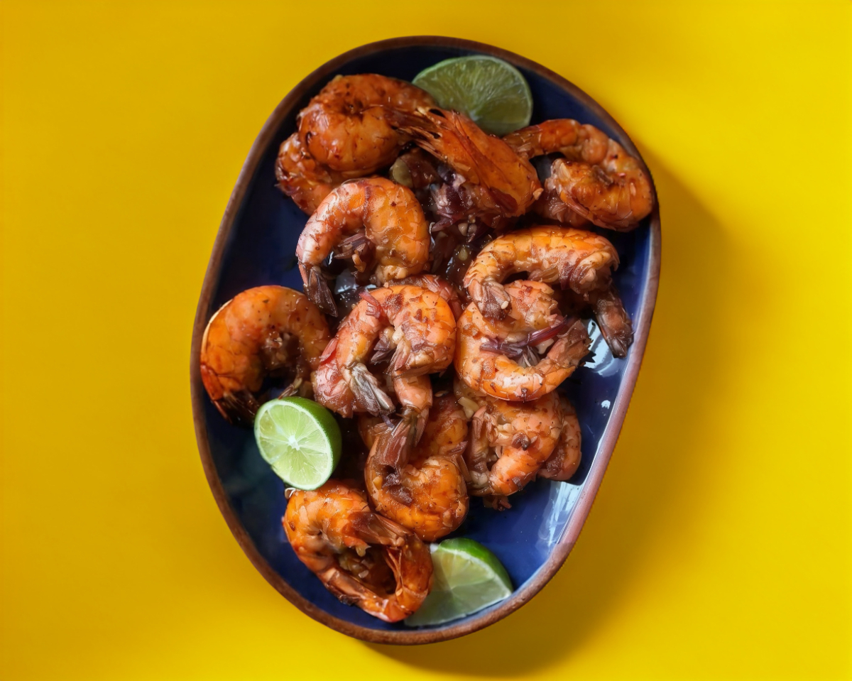 Camarones con cáscara, mantequilla y ajo, acompañados de arroz, ensalada y pan.