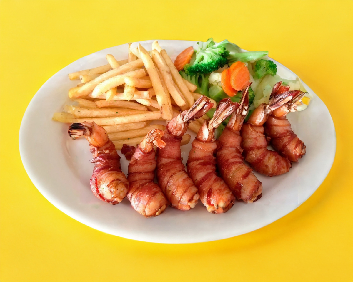Camarones con philadelphia, enrollados en tocino con aderezo chipotle.