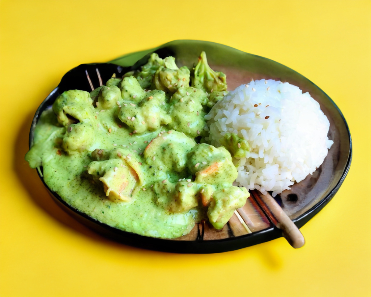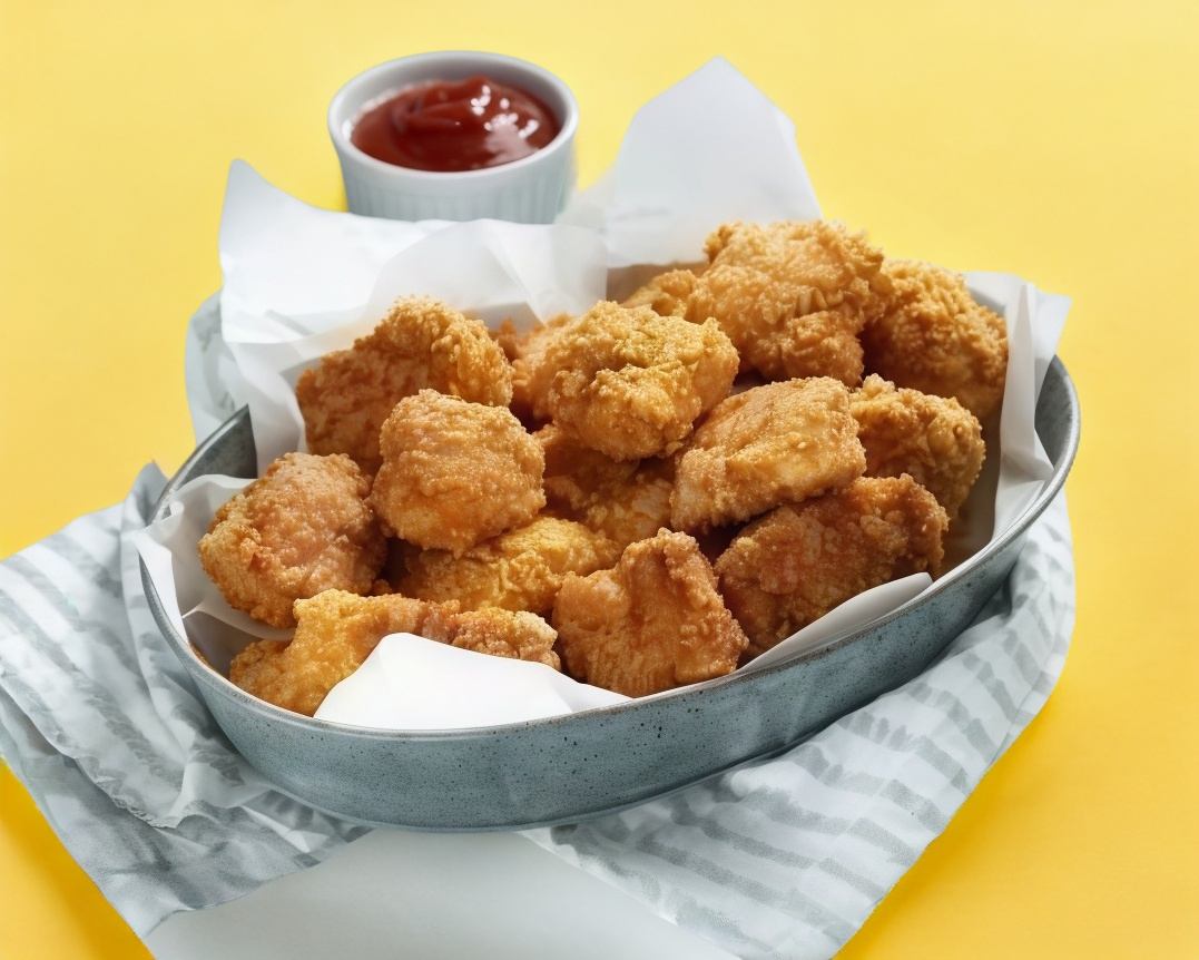 Camarones empanizados con coco rallado, acompañados de una salsa de mango con papas fritas.