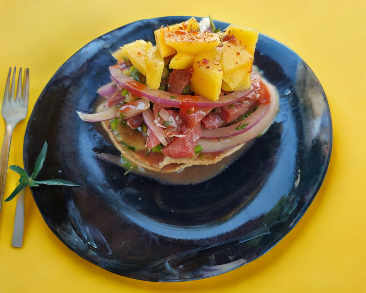 Tostada de callo curtido, cebolla, pepino, cilantro y mango.