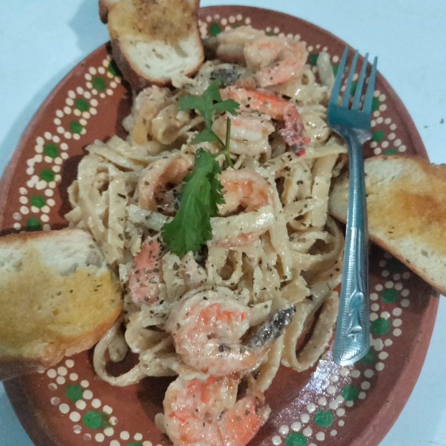 Pasta con camarones salteados al vino blanco, crema y queso parmesano acompañado de pan con mantequilla