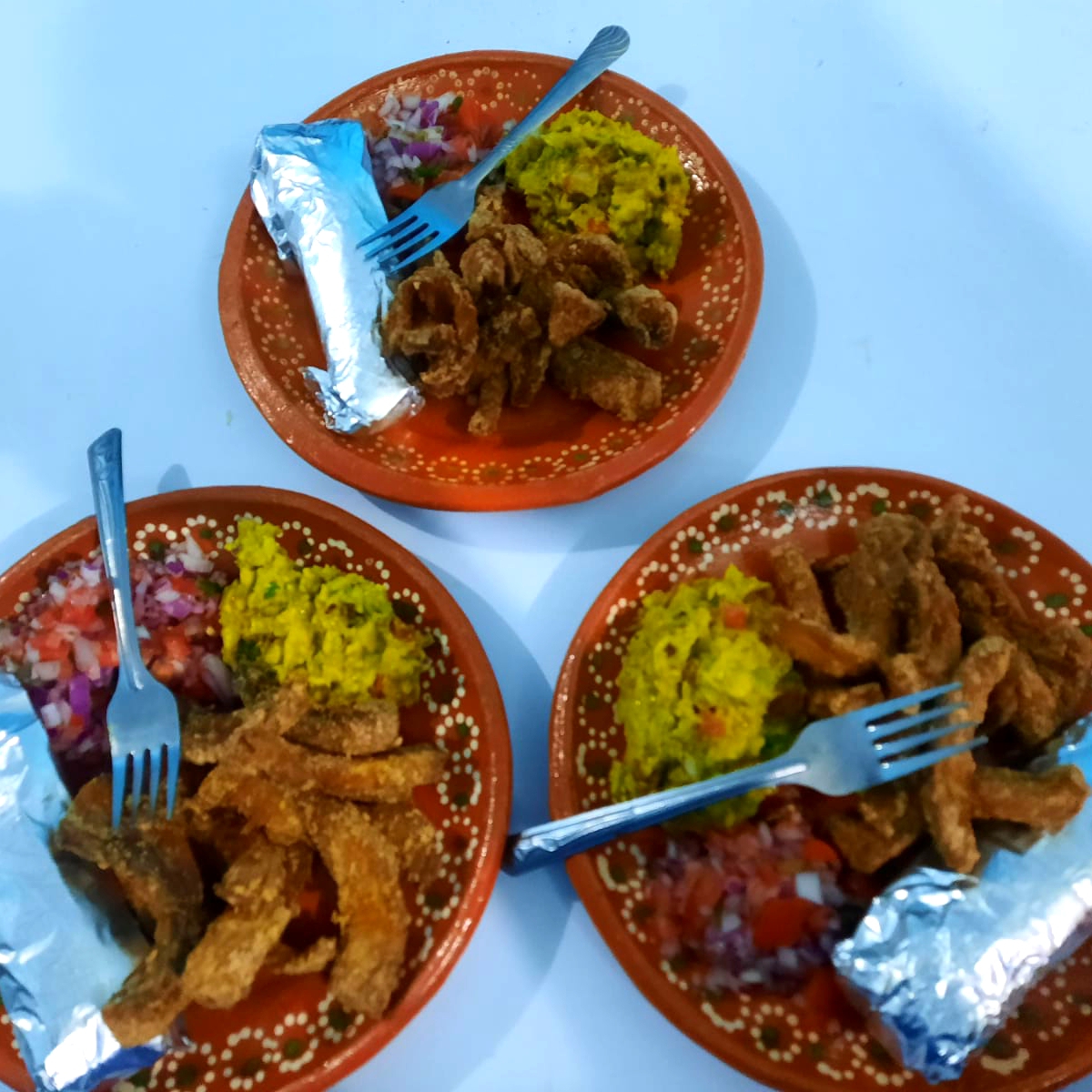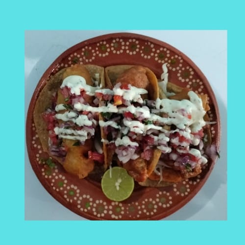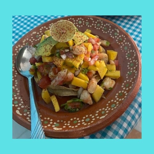 camaron picado y curtido en limon, salsa mexicana mango y salsas de la casa