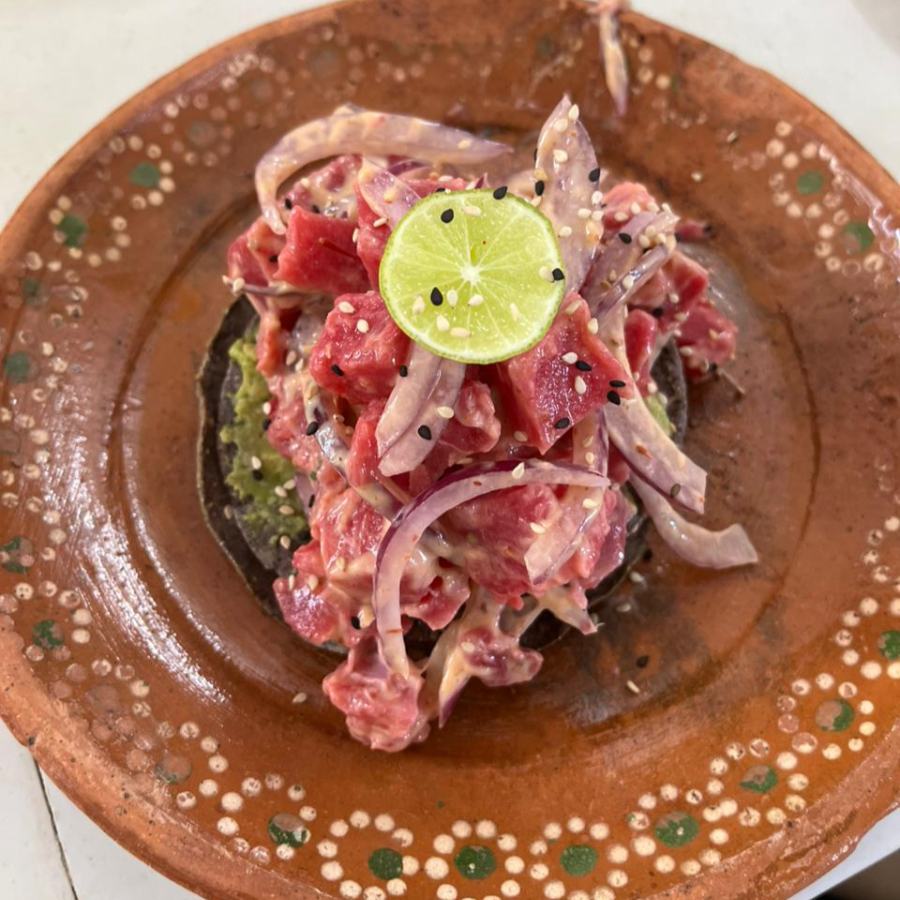 atun en cubos con aderezo chipotle flameados y montado en una cama de guacamole