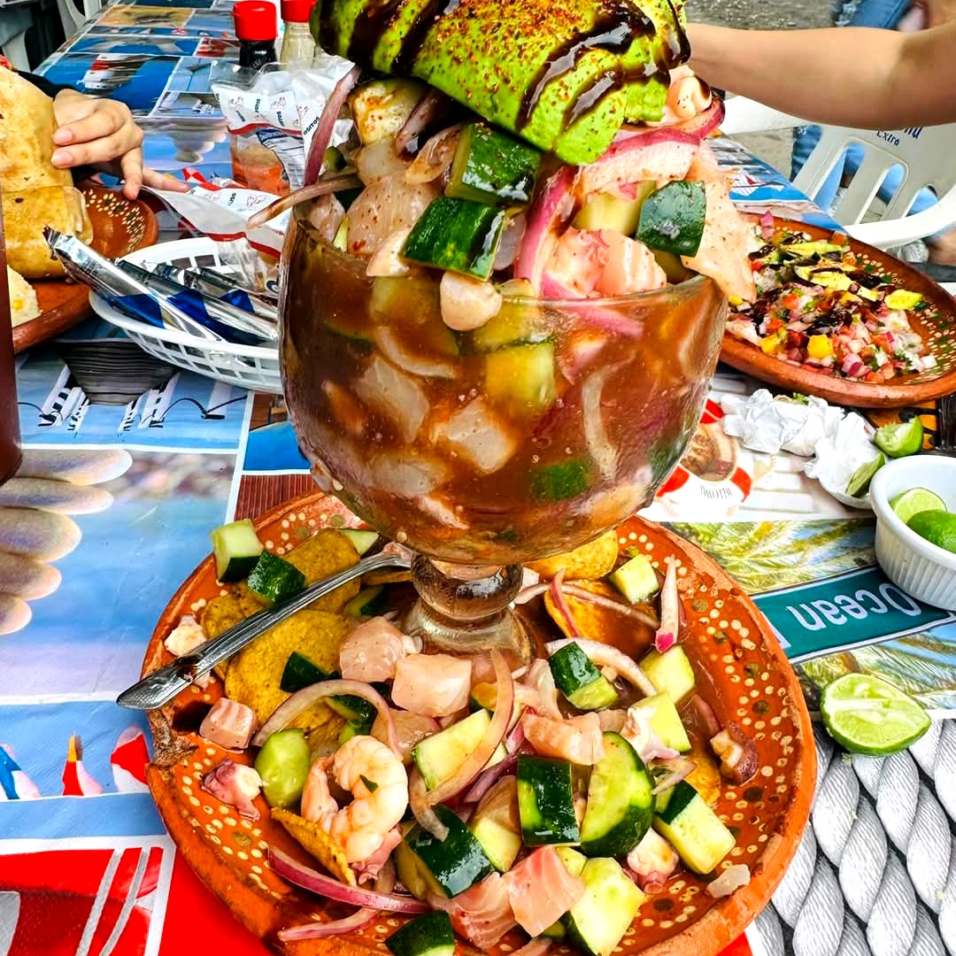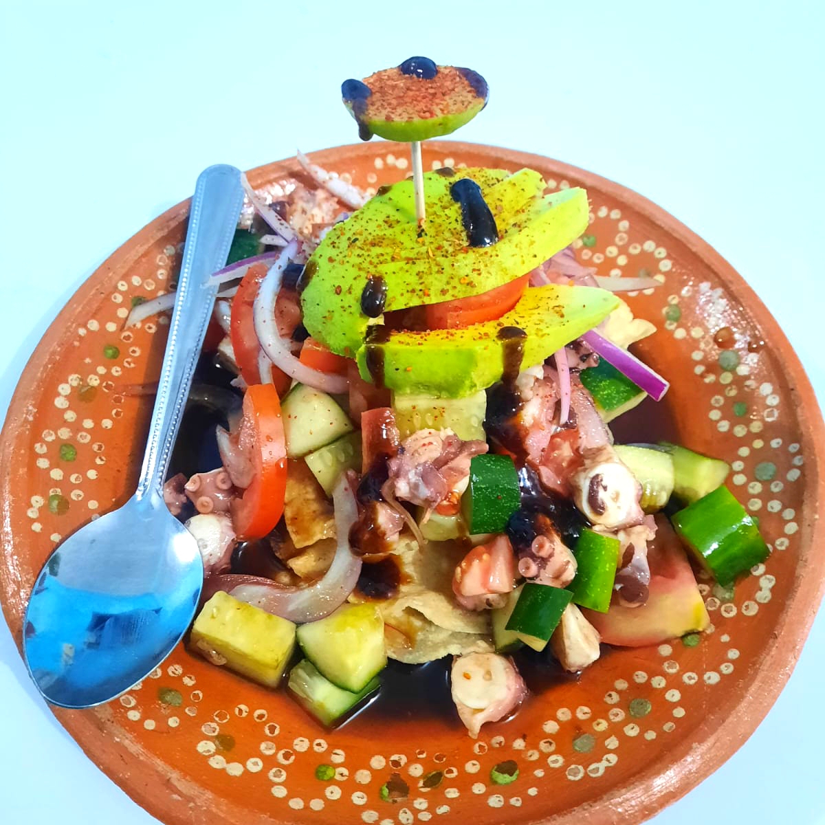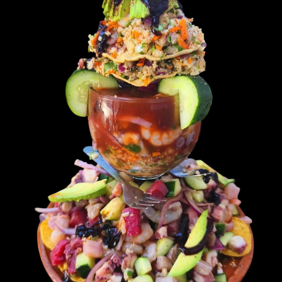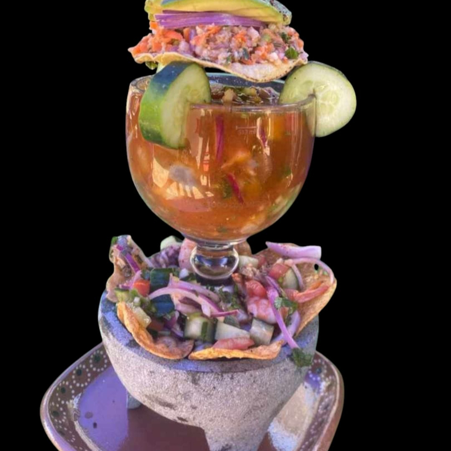 copa con camaron cocido, pulpo, callo, pescado, ostion, cebolla, salsa de la casa montada sobre una cama de tostitos y una tostada de ceviche