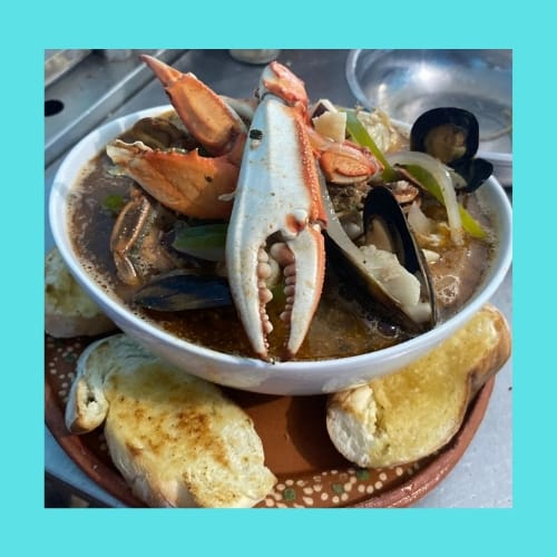 tremenda sopa de mariscos con Jaibòn, camaròn, pulpo, mejillones, pescado y callo. incluye pan con mantequilla