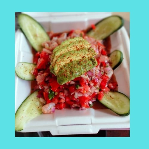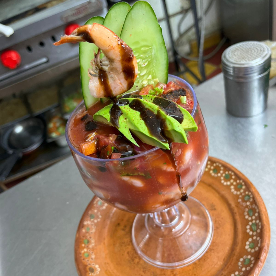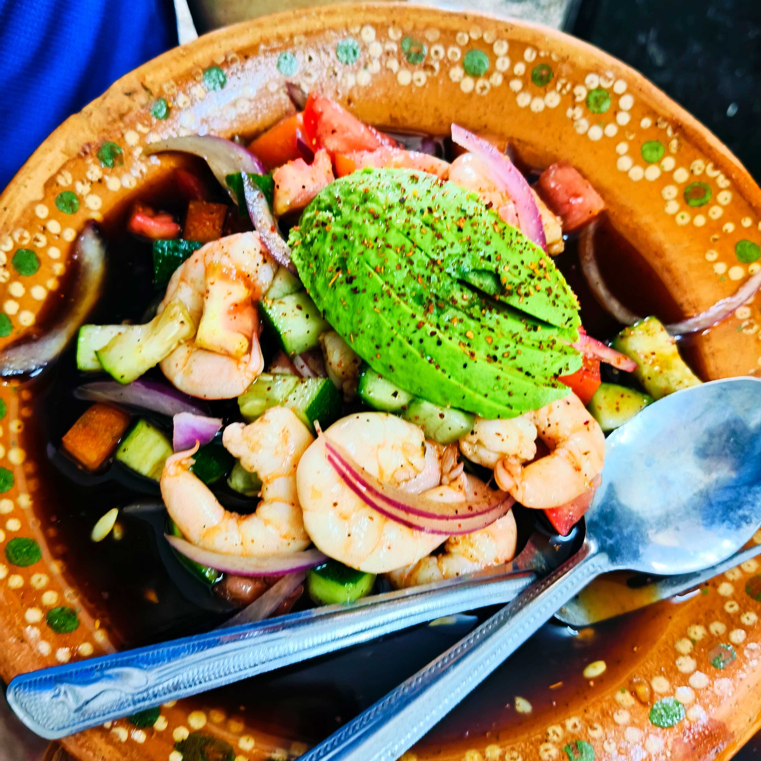 camaron curtido en limon marinado con cebolla y pepino bañado en la salsa de su preferencia
