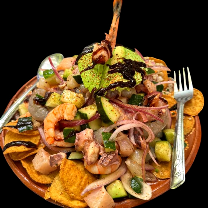 combinacion de camaron cocido, pulpo, callo, pescado, pepino y cebolla, salsa botanera montado sobre cama de ceviche y tostitos.