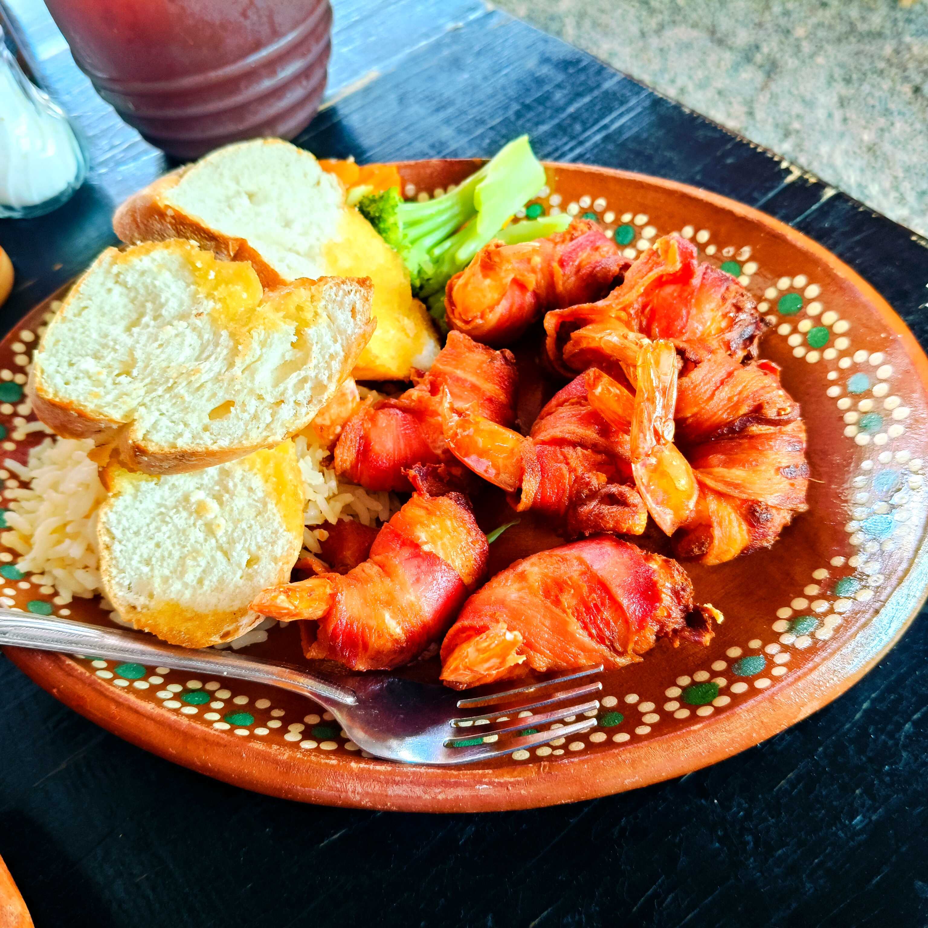 Camarones rellenos de queso philadelphia y jaiba, envueltos en tocino acompañados de arroz pan y verduras.
